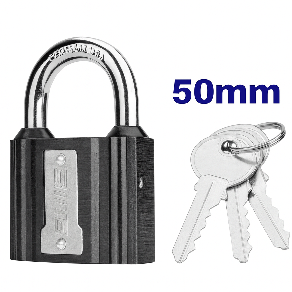 • Candado de hierro 50 mm con cilindro de latón, 3 llaves y cubierta impermeable