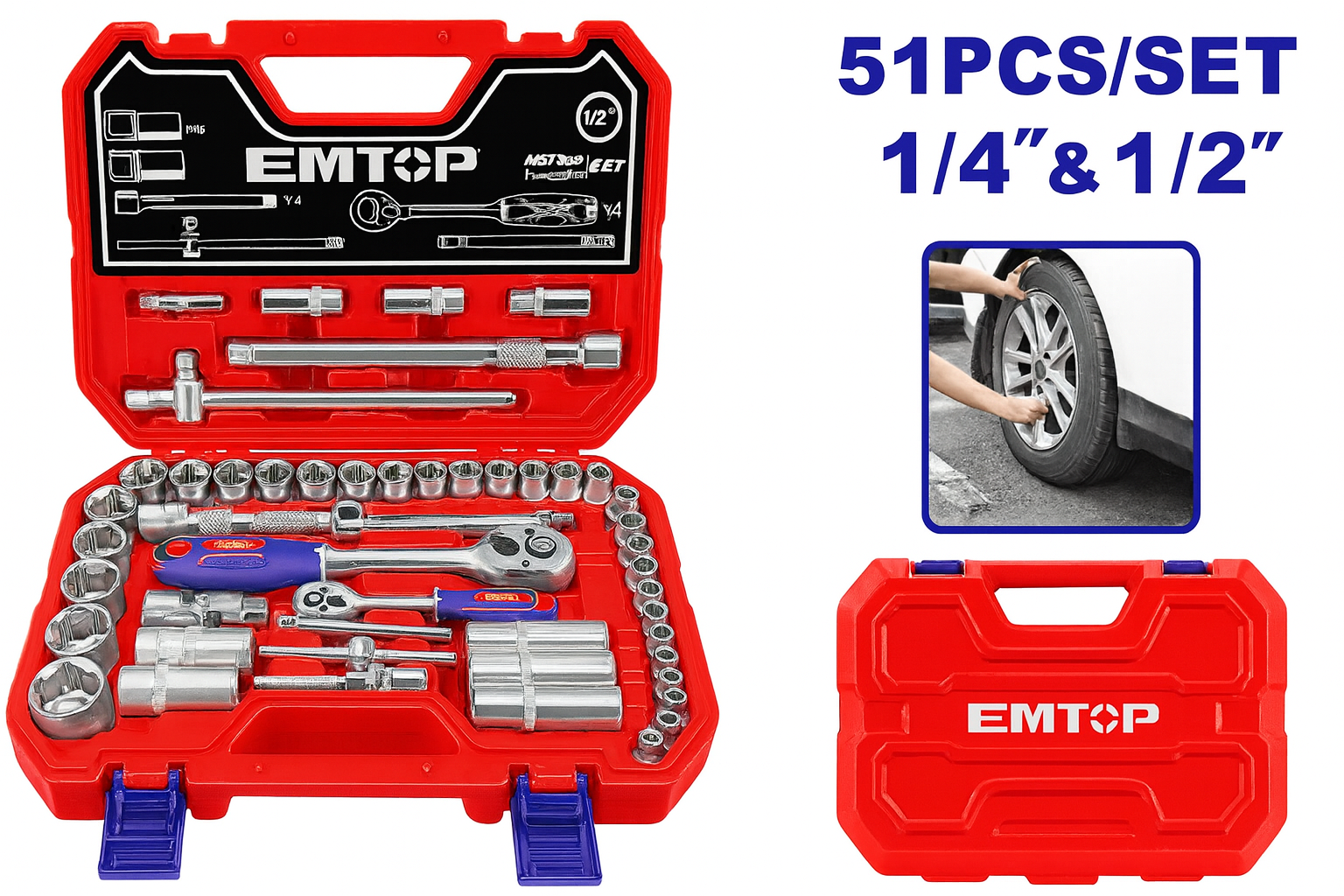 Juego de Dados y Llaves de 51 Piezas 1/4" + 1/2"