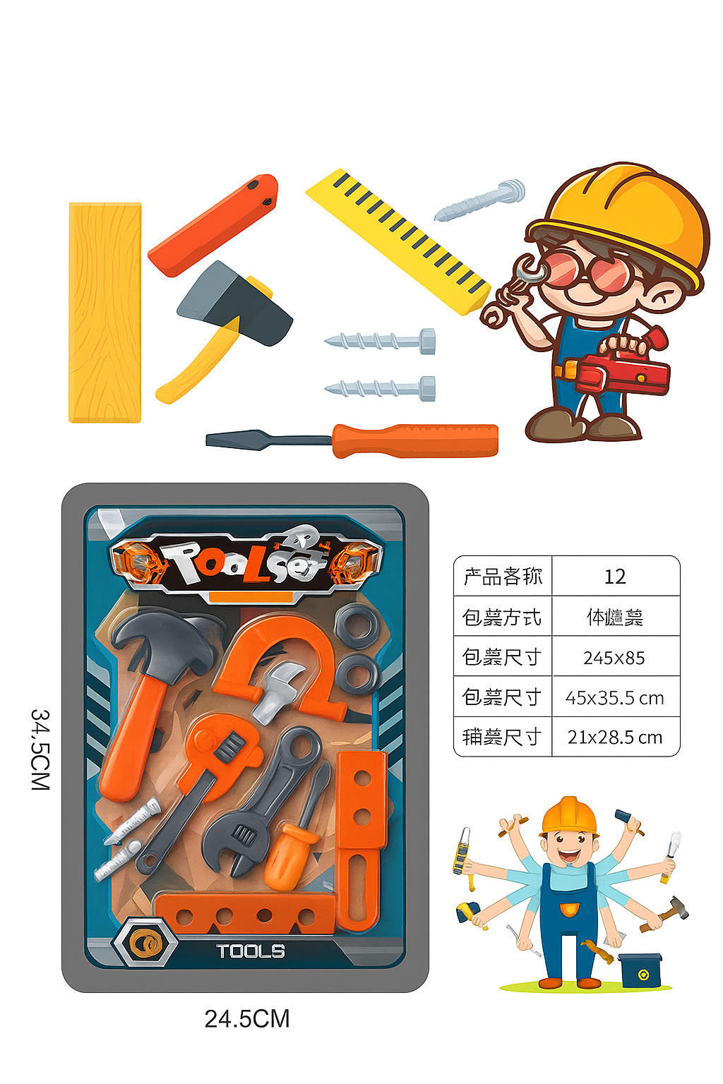 El set de herramientas modelo 8899-12 es ideal para que los niños aprendan jugando, desarrollando su creatividad, coordinación y habilidades manuales. Fabricado en plástico resistente y seguro, incluye herramientas de juguete realistas, que permiten a los pequeños simular trabajos de reparación y construcción de forma divertida y sin riesgos. Perfecto para el hogar, guarderías o como regalo educativo.