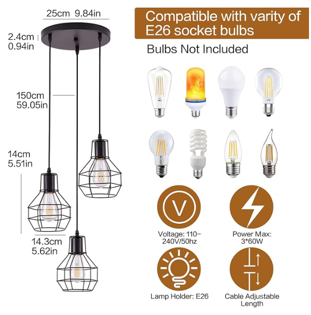🔌 Portalámparas: E27 × 3 (no incluye bombillos)