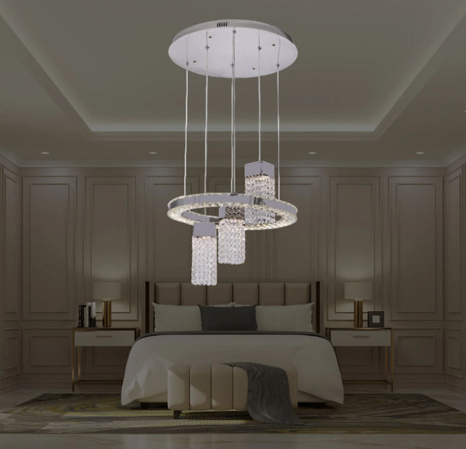 La lámpara colgante de cristal LED Y0424070011 combina elegancia moderna y tecnología avanzada. Fabricada en acero inoxidable con un diseño circular de Ø500 mm, ofrece un brillo sofisticado y regulable mediante control remoto 2.4G, ideal para ambientes refinados y contemporáneos.