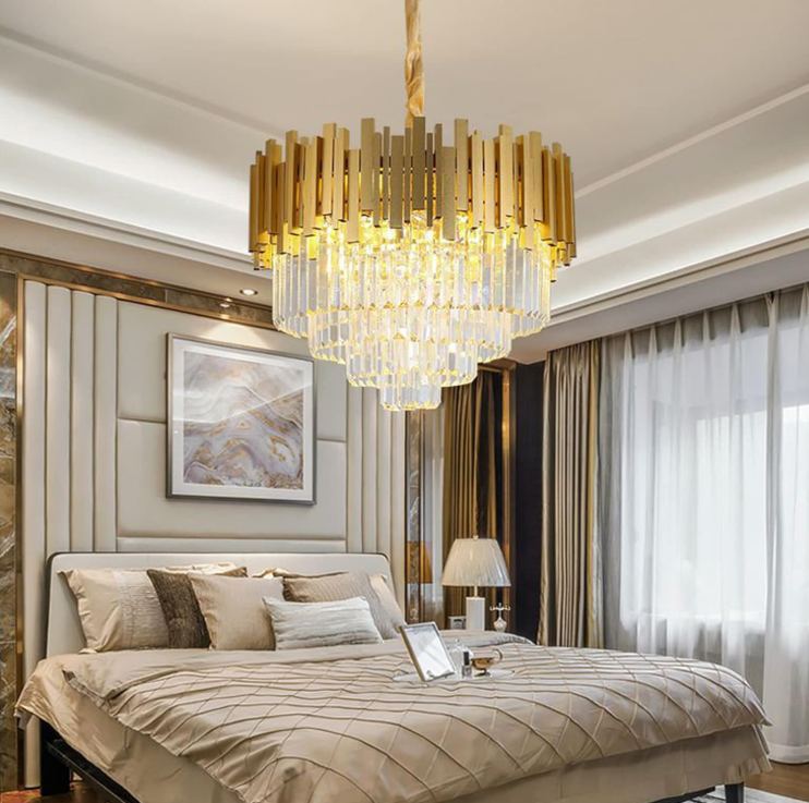 La lámpara colgante de cristal LED M0224080055 es una pieza de diseño moderno y sofisticado que combina materiales de alta gama con un acabado dorado electrochapado de gran brillo y durabilidad, elaborada en aluminio anodizado, cristal, hierro y acero inoxidable, refleja un equilibrio perfecto entre elegancia y resistencia.