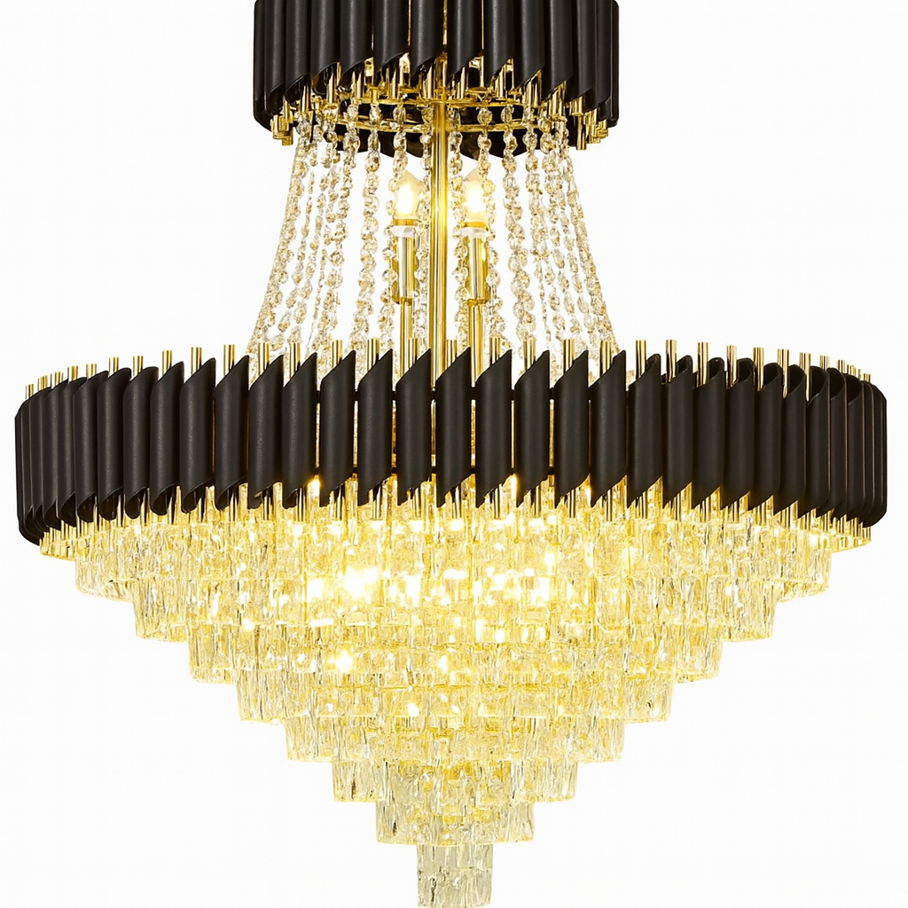 La lámpara de cristal de lujo LG-MY40801060 combina diseño contemporáneo, materiales de alta calidad y una estética sofisticada que aporta elegancia a cualquier ambiente. Su estructura de Ø400 × H520 mm, fabricada en cristal y hierro con acabado negro pintado, se complementa con una base de techo dorada electroplateada, logrando un contraste visual moderno y distinguido.