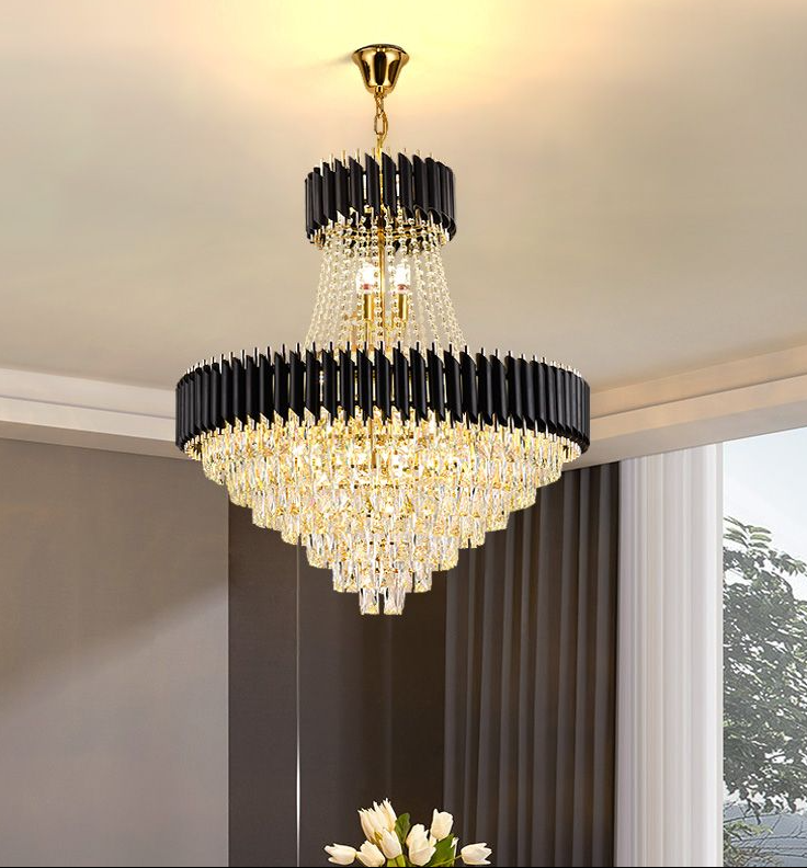 La lámpara de cristal de lujo LG-MY40801060 combina diseño contemporáneo, materiales de alta calidad y una estética sofisticada que aporta elegancia a cualquier ambiente. Su estructura de Ø40 × H52 cm, fabricada en cristal y hierro con acabado negro pintado, se complementa con una base de techo dorada electroplateada, logrando un contraste visual moderno y distinguido.