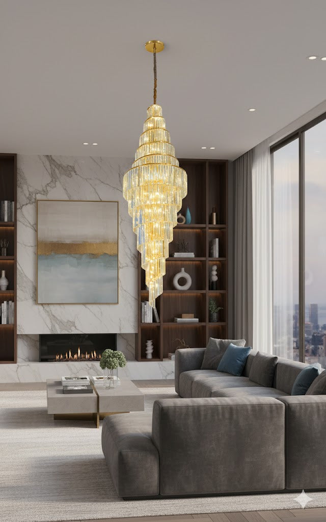 La lámpara de cristal de lujo LG-MY40801068 es una pieza deslumbrante que combina diseño majestuoso, materiales de alta gama y un acabado impecable. Su estructura de 80 × 220 cm, elaborada en cristal y material electroplateado, presenta un acabado dorado brillante que aporta elegancia, lujo y sofisticación a cualquier ambiente.