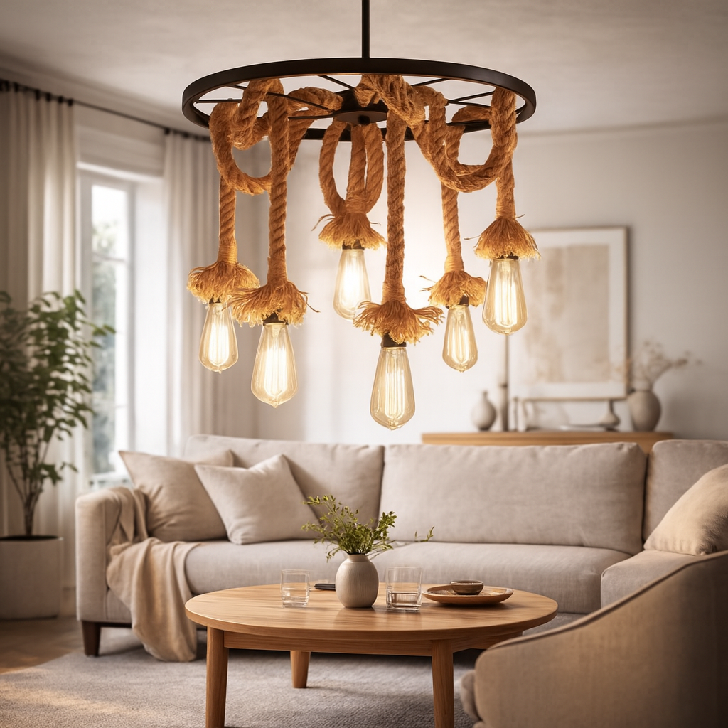 Ideal para restaurantes, comedores, salas, bares, hoteles o espacios con decoración rústica, natural o boho-industrial. Su combinación de metal oscuro y fibras naturales genera una iluminación acogedora, equilibrando lo artesanal con lo moderno.