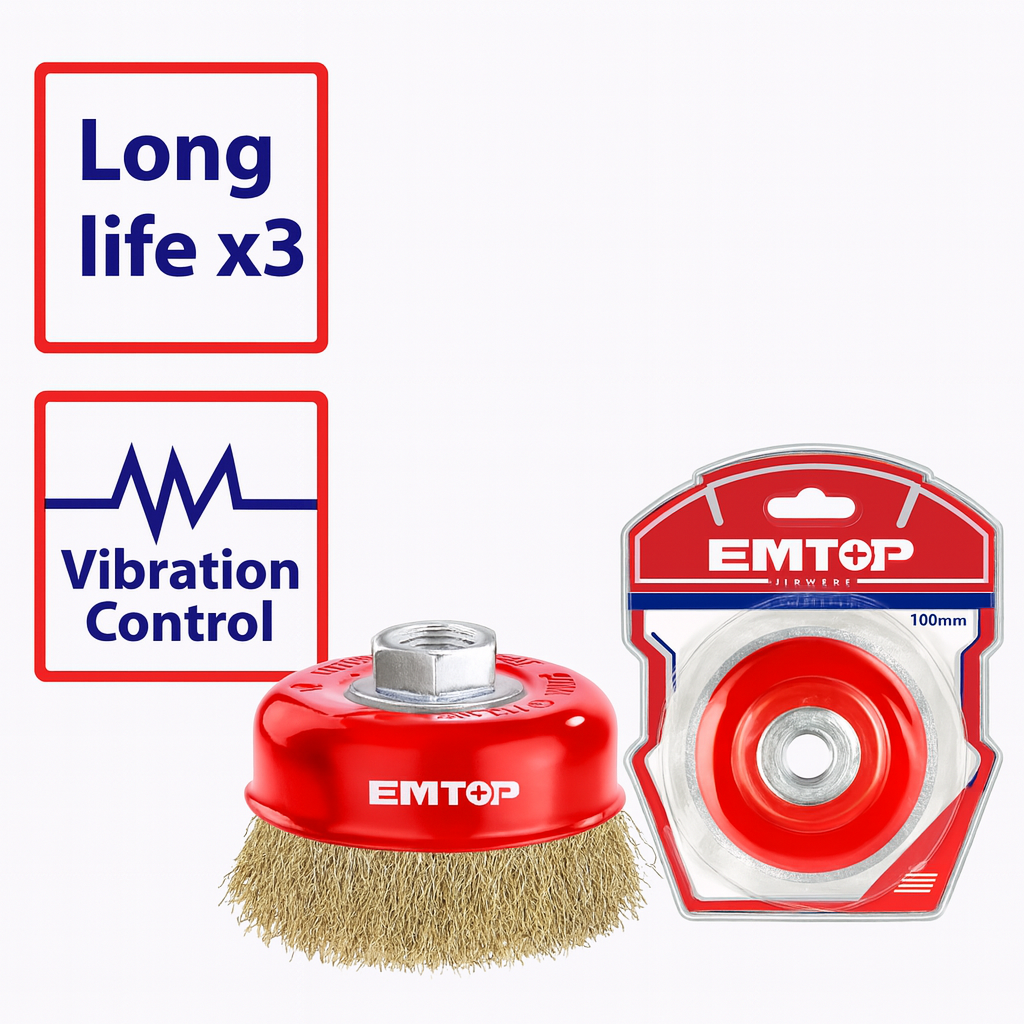 Elimina óxido, pintura y rebabas con potencia y durabilidad profesional con el cepillo de copa EMTOP.