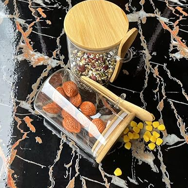el vidrio grueso y transparente permite identificar fácilmente el contenido, mientras que la tapa de bambú con sello de silicona hermético garantiza un cierre seguro que conserva la frescura y evita la humedad.