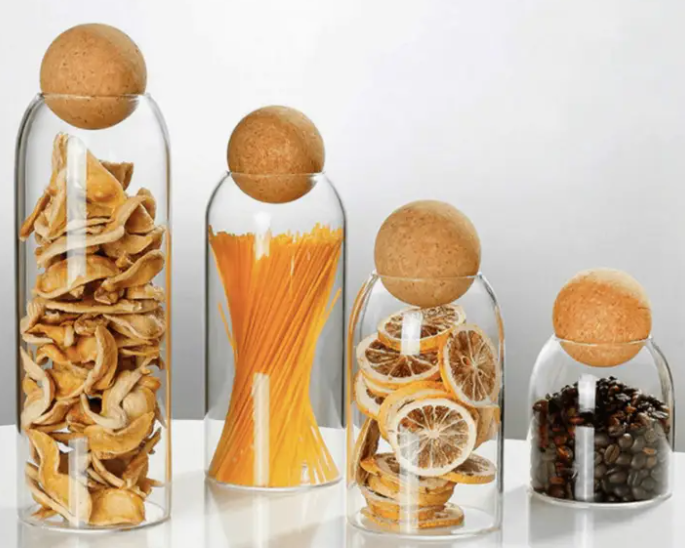 El tapón de corcho proporciona un cierre firme y natural, ideal para conservar alimentos secos o exhibir elementos decorativos. Perfecto para almacenar granos, pastas, galletas, ventas de baño, flores secas o accesorios pequeños, manteniendo todo a la vista con un estilo cómodo.