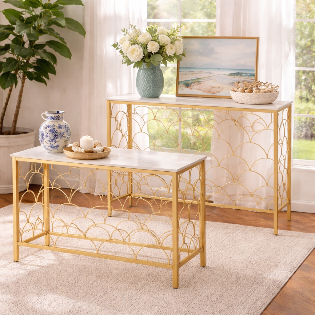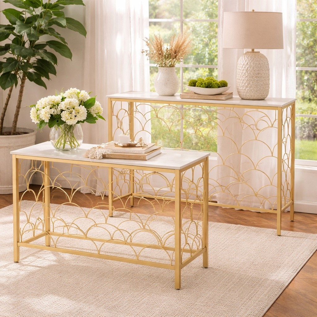 Este duo de mesas de entrada es ideal para decorar y organizar tu recibidor. Perfectas para colocar llaves 🔑, adornos 🕯️, plantas 🌿 o bolsos 👜, aportando un toque moderno y práctico a tu hogar.