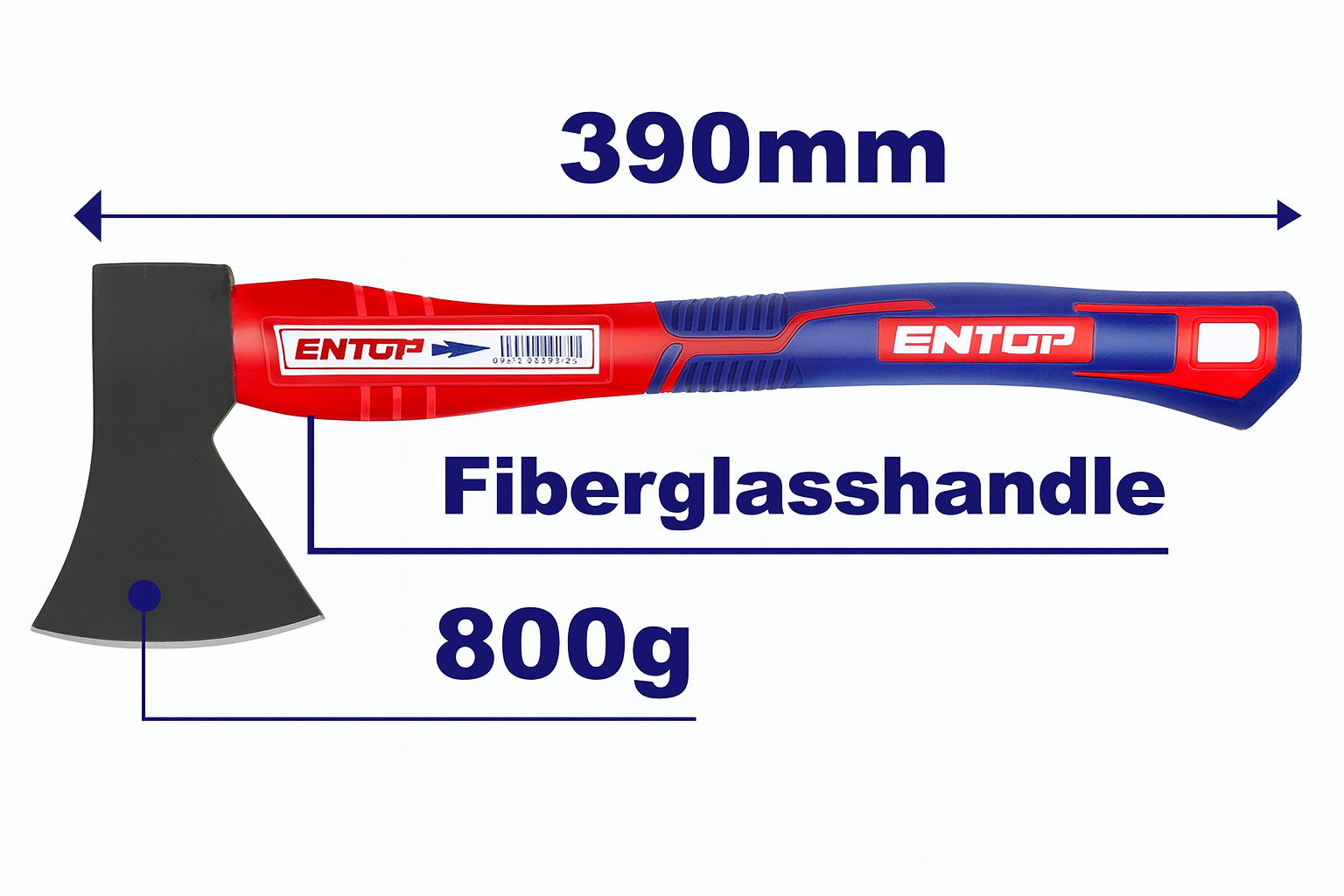 • Hacha de 800 g con mango de fibra de vidrio y cabeza forjada en acero al carbono 45#