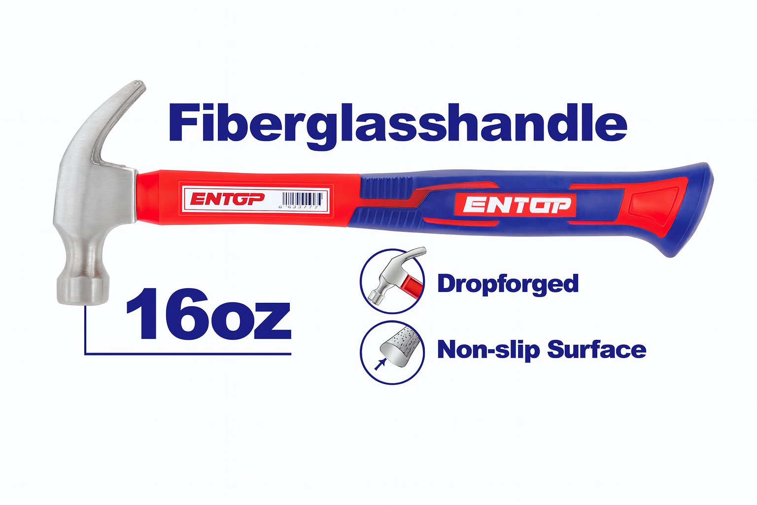 Martillo de uña de 16 oz (450 g) con mango de fibra de vidrio antideslizante y cabeza forjada en acero al carbono 45#
