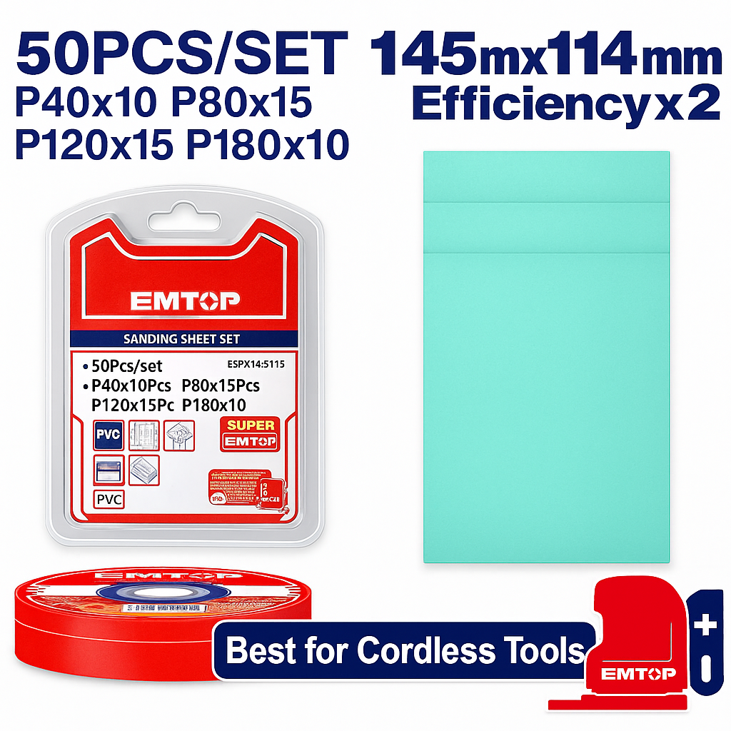 Set de hojas de lija EMTOP 145×114 mm (50 piezas) para madera, metal, pintura y más