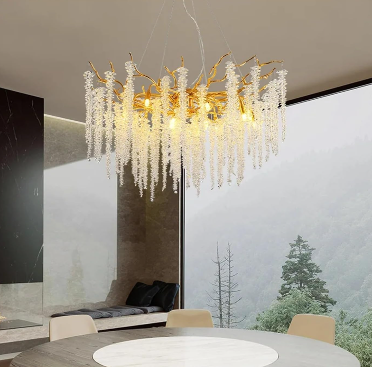 el soporte de techo en dorado francés electrolítico añade un toque de distinción, mientras que sus 8 luces E14 proporciona una iluminación envolvente y armoniosa, ideal para comedores, salas, hoteles o espacios con estilo contemporáneo.
