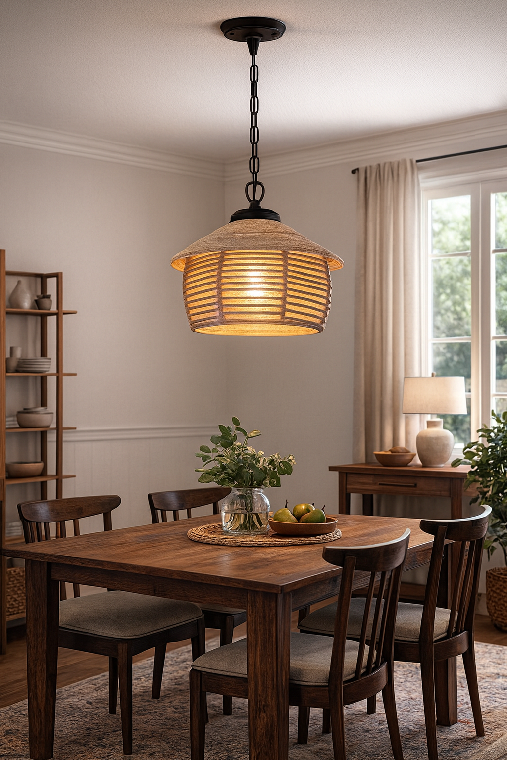 Ideal para comedores, salas, bares, cafeterías o espacios decorativos de estilo rústico, boho o natural.. Su diseño en fibra de yute crea una atmósfera cálida y artesanal perfecta para interiores acogedores.