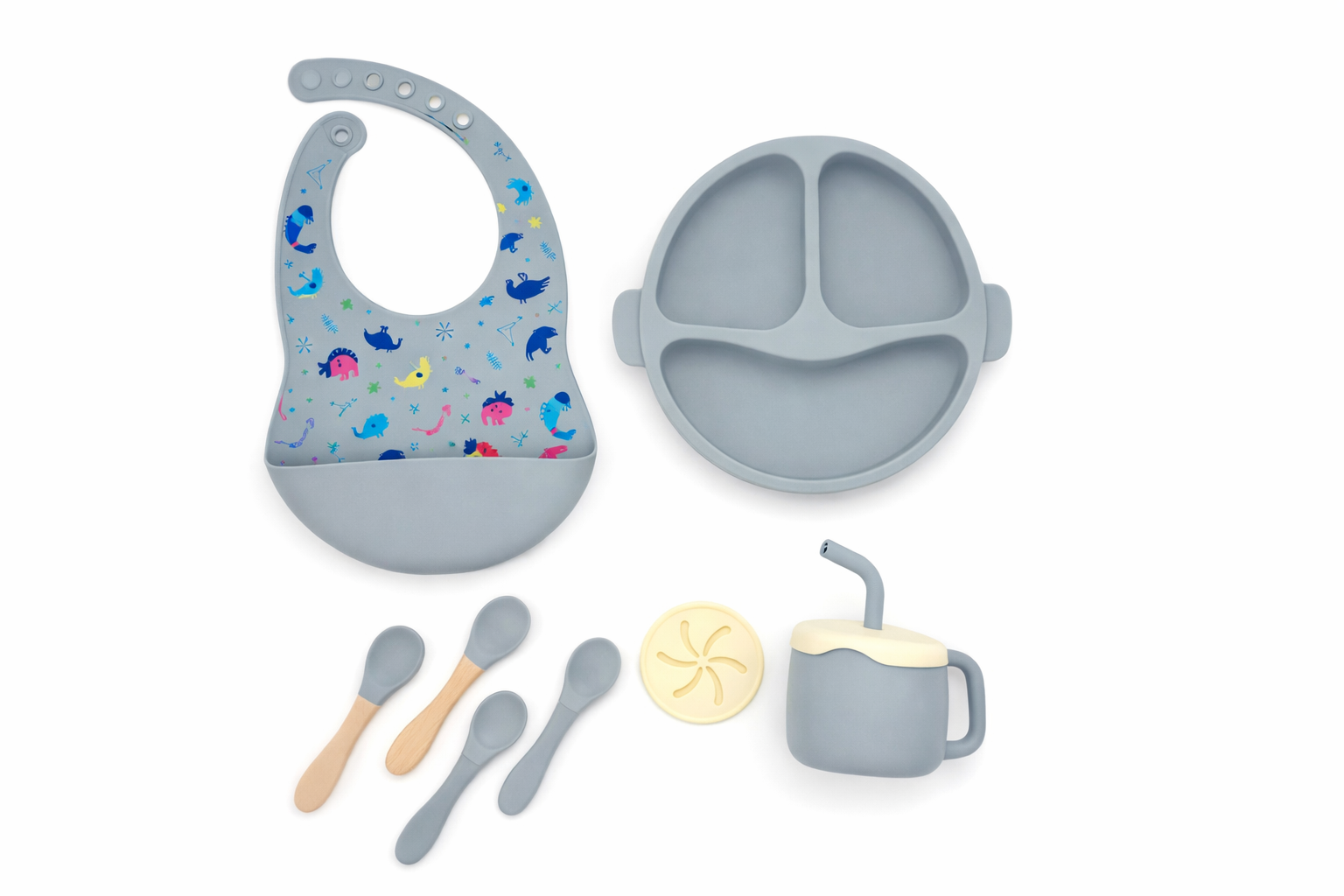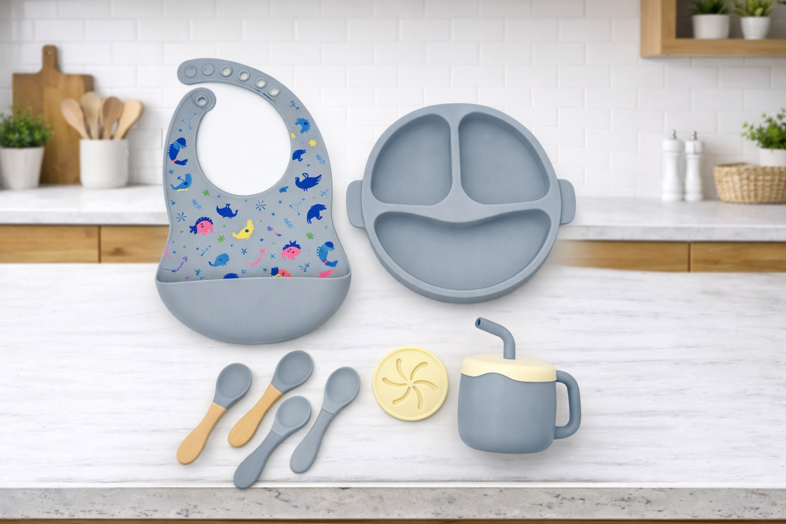 Acompaña a los peques en cada comida con este set de platos y cubiertos de silicona, ideal por su material suave, práctico y fácil de limpiar 🤍