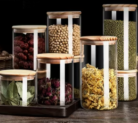 Su estructura alargada y transparente permite visualizar fácilmente el contenido, mientras que la tapa de bambú con sello hermético mantiene los productos frescos por más tiempo.